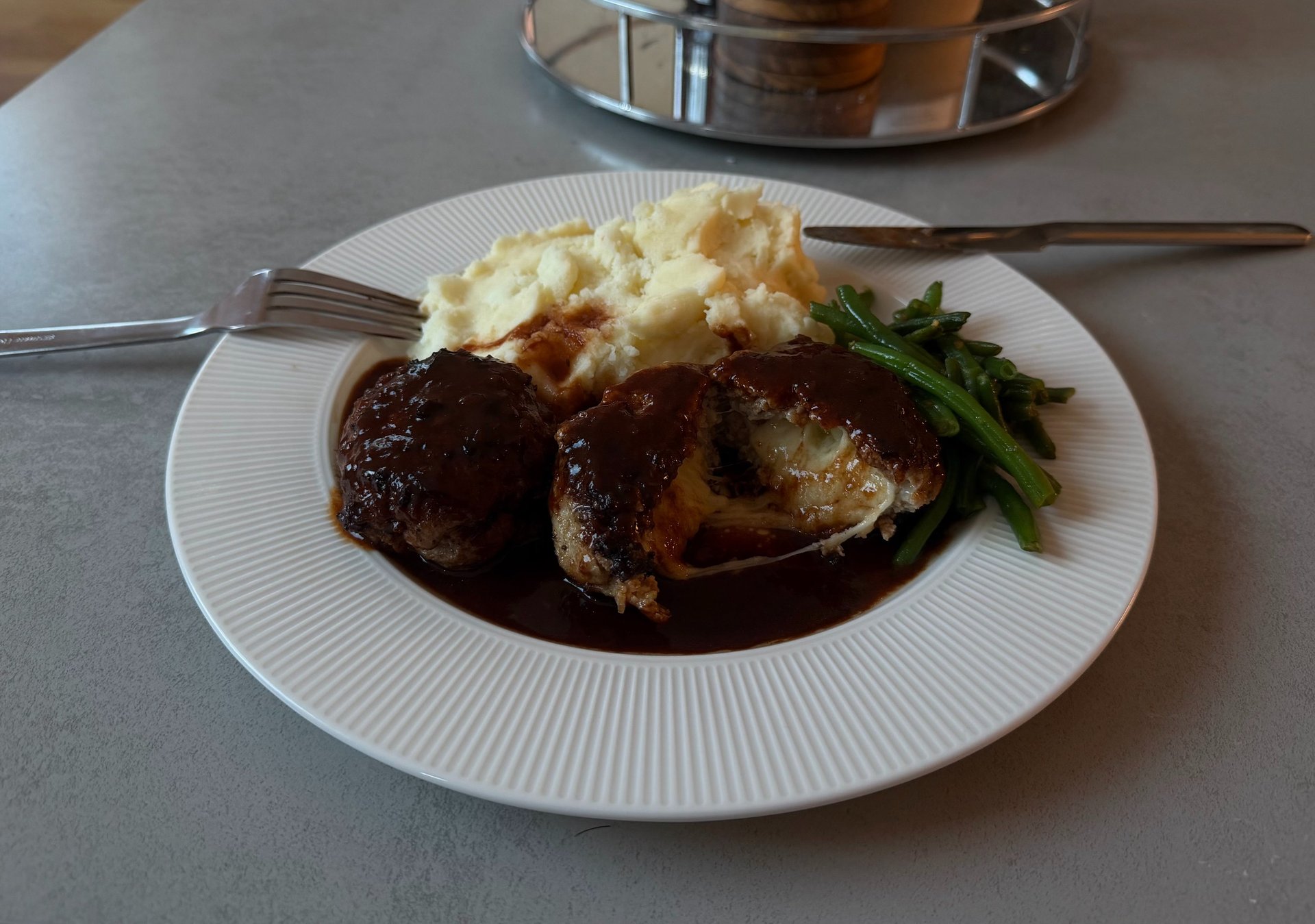 A refined take on classic pork patties. Juicy pork patties filled with aged cheese, gently cooked for tenderness and finished to achieve a perfect cheese pull. Served with silky potato purée, glossy port wine jus, and butter-glazed haricots verts.